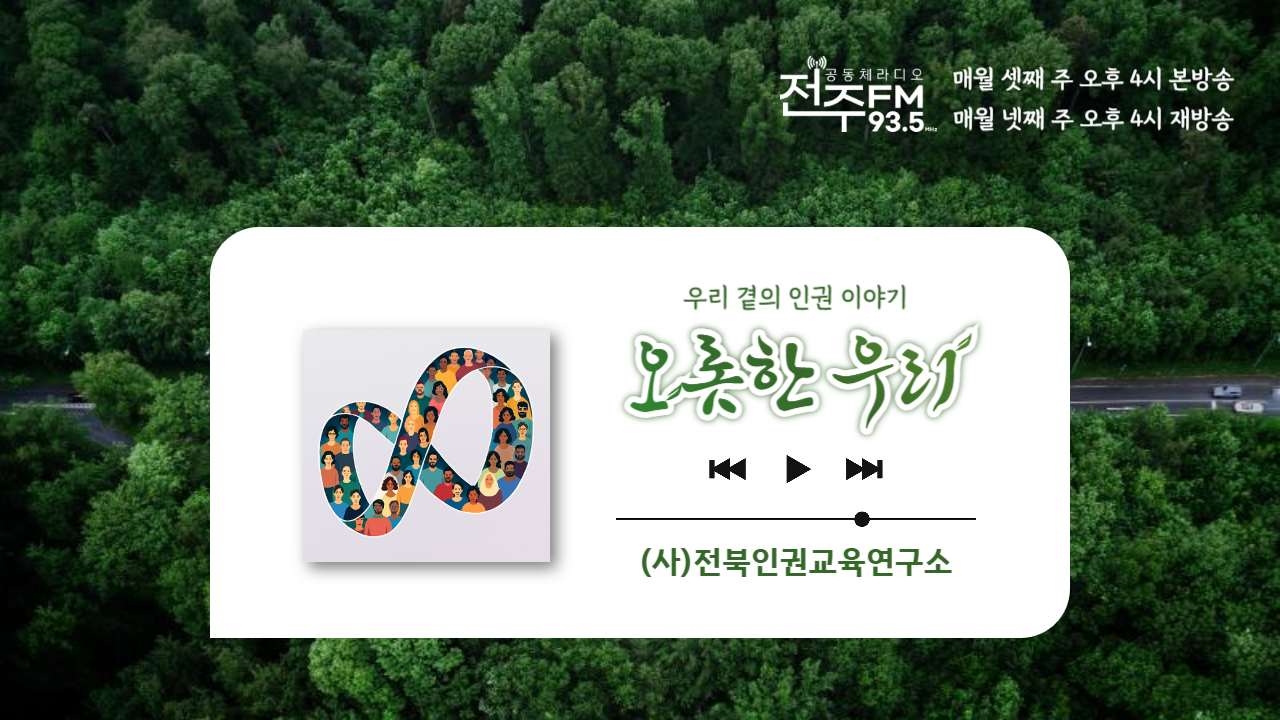 '청취자들에게 어려운 인권, 나와 별 상관없는 인권이 아닌 쉬운 인권, 나와 밀접하게 관련되어 있는 인권을 소개하는 프로그램' 무심코 사용하는 어떤 단어나 표현으로부터 매일 마주치는 일상에서 만나는 크고 작은 사건들까지.눈여겨보지 않았던 주변의 풍경부터 우리가 알아야 할 인권(이론)에 대한 이야기까지 다양하게 담아내는 프로그램입니다. 제작 : 김지영, (사)전북인권교육연구소 본방 : (월1회) 셋째 주 금요일 오전 9시재방 : (월1회) 넷째 주 금요일 오전 9시