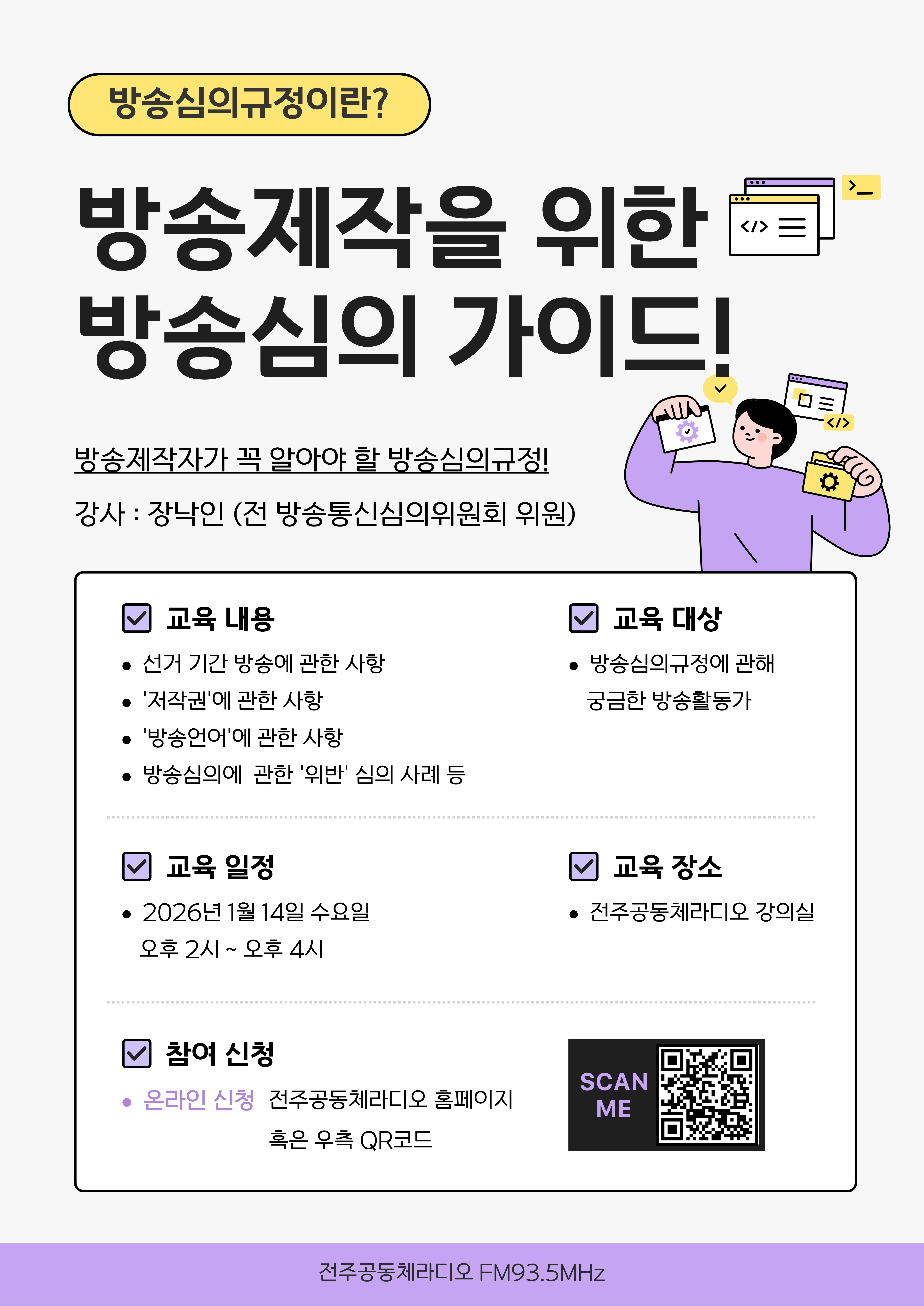 방송심의교육 참가자를 모집합니다!! - 교육일시 : 2026년 1월 14일 수요일, 오후 2시 ~ 오후 4시, 전주공동체라디오 강의실- 참여대상 : 방송심의에 관해 궁금한 방송제작자- 신청 방법 : 신청서 작성 제출 (https://forms.gle/N55Nc3MqRAfuMqkh9)- 강사 : 장낙인 (전 방송통신심의위원회 위원) <교육 내용>- 선거 기간 방송에 관한 사항- '저작권'에 관한 사항- '방송언어'에 관한 사항- 방송심의에 관한 '위반' 심의 사례 등